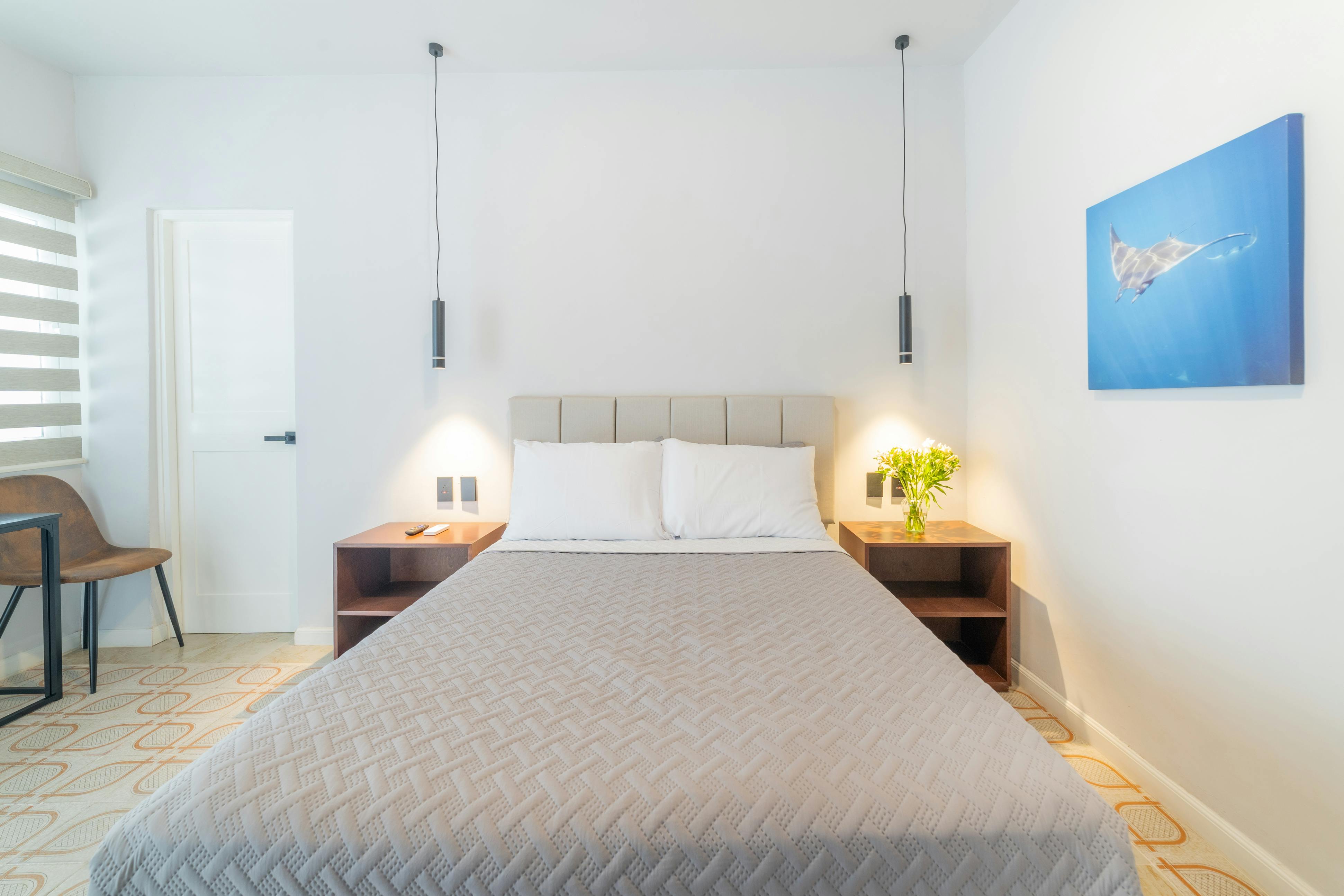 Habitación con cama king size, baño completo con ducha y amenidades de baño.